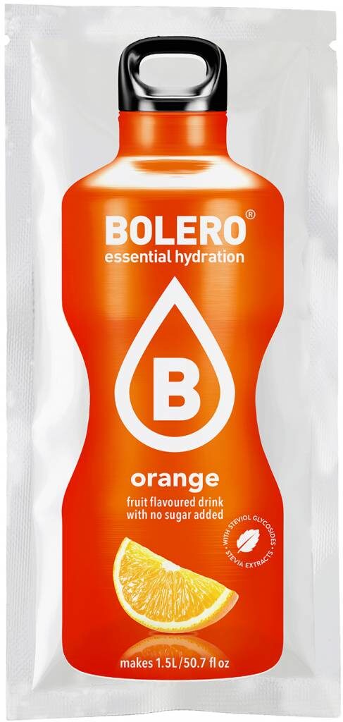 Bebida Bolero con sabor a Naranja. Con cada sobre de la bebida Bolero podrás prepararte 1,5 litros de tu bebida favorita. Las bebidas Bolero no contienen nada de azúcar, son aptas para todo tipo de personas, ya que no contienen ningún tipo de alérgeno.